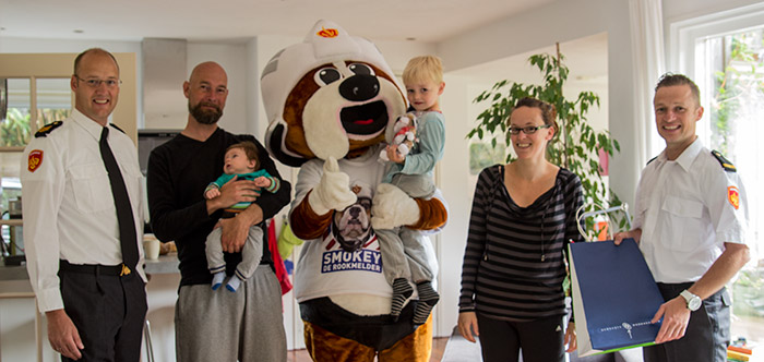 | Bijna een jaar is Smokey de Rookmelder in Peize actief als preventiemedewerker van de Peizer brandweer. In 2012 is een met de brandweerpost Peize een pilot met de 'Brandweer over morgen' gestart. Een van de onderdelen van het project is om het brandveiligheidbewustzijn onder de bevolking te vergroten. Zaterdag was Smokey met de brandweermannen Rene Posthumus en Marcel Giezen op pad om de (ouders van) pasgeborenen te bezoeken. Zij kregen een rookmelder uitgereikt, een boekje met handige tips en een checklist om in de eigen woning de genomen brandpreventiemaatregelen te checken. Van de familie Smit/Ekamper waar onlangs Youk werd geboren, was Bente direct blij met de Smokeyknuffel die ook in het pakket van de brandweer zat. 'Bij de geboorte van zo'n kleine ga je toch ook nadenken over dit soort zaken', liet de familie weten, Ook over hoe je van de bovenverdieping komt als dat niet via de trap kan was nagedacht. Op de website van de gemeente Noordenveld is een overzicht van de Smokey bezoeken terug te zien |