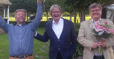 | Afgelopen woensdagavond heeft Peizer makelaar Roelant van Hemmen(r) het in NVM-kringen bekende makelaarsstafje ontvangen. Vijventwintig jaar geleden is hij door de president van de rechtbank in Assen tot makelaar-taxateur in onroerende goederen beëdigd. Naast Hemmen is zijn mede bestuurslid van de NVM Drenthe Jan Weide ook 25 jaar makelaar-taxateur. Reden genoeg voor landelijk NVM-voorzitter Ger Hukker om beide heren het stafje + oorkonde persoonlijk te komen overhandigen. |