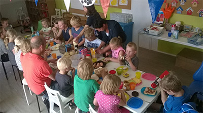 | Behalve gevolgen voor de basisscholen in verband met de verandering van de roosters met middagpauze naar een week met vijf gelijke lesdagen heeft dit ook gevolgen voor de verschillende tussen schoolse kinderopvang in het dorp. Bij Villa Kakelbont hebben ze daar tijdens de laatste TSO middag met een heerlijke lunch bij stilgestaan. Speciaal voor deze laatste TSO waren er heerlijke broodjes en lekker beleg, die door de kinderen lekker met elkaar werden genuttigd. |