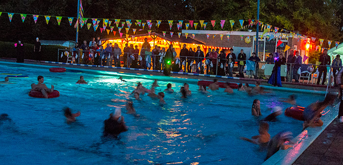 jagende muziekklanken. Mede door de zaklampen van duikers leverde dit een zeer spookachtige sfeer in het Zomerbad op. Met spoken, heksen en trollen kwam er ook nog van allerlei engs met raar verlichte vingers rond het bad gelopen. Het bleken tikkers te zijn die probeerden de kinderen op te jagen en af te tikken. Na driemaal getikt te zijn dienden de kinderen zich aan te kleden. Met een buitentemperatuur van 11 graden hoefden de kinderen hier niet lang over na te denken en zorgden ze snel dat ze wat warms aankregen. Uiteindelijk was het Anne-marijn Berghuis die het langst de spoken wist te ontduiken. |
