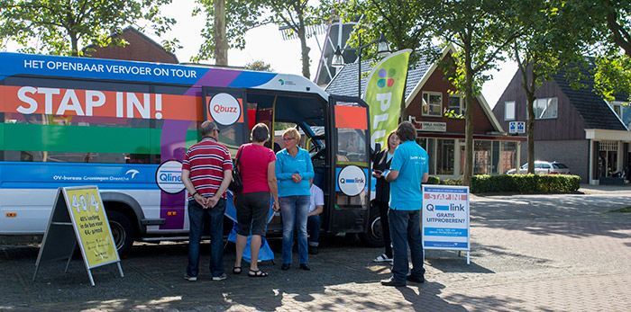 | Op het parkeerterrein bij Plus de Weerd stond donderdagmiddag de Q-link on tour promotiebus. Q-link het nieuwe snelle busnet tussen Groningen Stad en de grotere woon-werkplekken daaromheen. Langs Peize komt in de spits om de tien minuten een Q-link bus op de lijn Roden-Beijum. De promotie medewerkers deelden in Peize een gratis probeerreis uit aan geïnteresseerde reizigers. Binnen een week mag men een dag gebruik maken van de vier Q-link lijnen. De Q-link is in de plaats gekomen van de paar jaar geleden opgeheven, toen nog door Peize rijdende, lijn 82 iets wat veel inwoners
