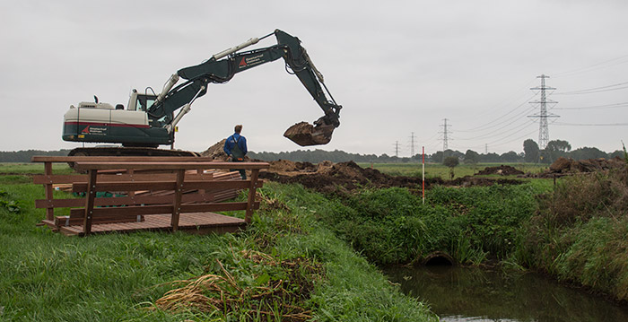 | Dinsdagochtend zijn medewerkers van aannemer Oosterhof Holman begonnen met het uitgraven van de duiker die in de Zuiderdijk ligt. Over het water dat in de Gouw uitkomt komt een hardhouten fiets- en wandelbrug te liggen. Hiermee wordt het besluit uitgevoerd om de Zuiderdijk af te sluiten voor doorgaand gemotoriseerd verkeer, zoals dat is opgenomen in het Herinrichtingsplan Peize. De medewerkers die op de Zuiderdijk aan het werk waren dachten dat de brug in de loop van volgende week door fietsers gebruikt kan worden. |