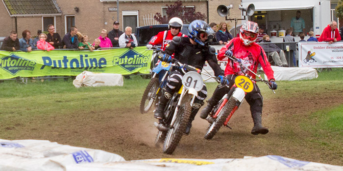 | Zondagmiddag vulden de klanken van de 'Boys from Pais' en hun vrienden weer de omgeving van het evenemententerrein aan de Brinkweg. Bijna honderd rijders waaronder een klein dertig rijders uit Peize demonstreerden hun kunnen op de meestal oudere tweewielers. In de verschillende klasses werd er deze middag zo'n veerig maal gestart waarna er vol om de eer om als te finishen werd gestreden. Op de foto de strijd tussen de Peizenaren Luinge, Mensinga en Oldenburger om de laatste plaats te ontlopen. |