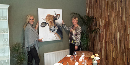 | Leendert en Naomi Scholtus eigenaren van restaurant 'De Goudplevier' hanteren bij de aankleding van het restaurant dezelfde filosofie als die van de gerechten uit keuken aan; 'Waar het kan van dichtbij'. Daarom hangt er vanaf nu kunst van Peizer kunstenares Karin Hoijting (l) in het restaurant. Sinds de opening dit voorjaar van het restaurant aan de Groningerweg in Peizerwold waren de Scholtus op zoek naar een passende aankleding van de wanden. Met het werk van Karin Hoijting hebben ze precies gevonden ze zochten. Voor Hoijting is de natuur een grote inspiratiebron vooral het schilderen van dieren is een grote passie. Wat past dan beter in 'De Goudplevier' die midden in de 'nieuwe' natuur staat! |