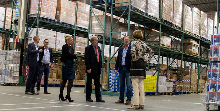 | Vrijdagochtend werd het distributiecentrum van Op=Op Voordelshop op de Westerd, in het kader van zijn maandelijkse bezoeken, door burgemeester van der Laan en wethouder Wekema bezocht. Samen met Liesbeth Korf en Luuk Ronde van de afdeling economische zaken kregen ze na een hartelijk ontvangst een aardige inkijk in het reilen en zeilen van, het sinds juni in het voormalige Coop pand gevestigd, bedrijf. De directieleden Vincent Alkema en Jos Venema schetsten kort de historie van het bijna twintig jaar oude bedrijf dat, nu men van uit Peize opereert bijna wekelijks een nieuwe winkel ergens in het land opent. Ingrid Alkema die namens Matchpunt ook bij het gesprek aanwezig was vertelde dat door de prettige samenwerking met het bedrijf er ondertussen al twaalf mensen uit de regio aan een baan waren geholpen en dat, met de groeiplannen van de organisatie, dit er mogelijk nog meer gaan worden. Wethouder Wekema had als consument al een idee tot uitbreiding van de werkgelegenheid in de winkel in Roden op gedaan. Na de rondleiding over de ruim drie voetbalvelden grote werkvloer kreeg het bedrijf van de burgemeester als blijk van waardering nog de gemeentevlag overhandigd. |
