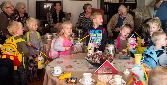 De bewoners van De Hoprank kan het niet ontgaan dat het dinsdag weer Sint Maarten is. De peuters van peuterspeelzaal het Hummelhonk kwamen 's ochtends met hun 'lichies' langs. De kinderen begonnen met elkaar op de huiskamer van de dagbesteding en zongen samen met de ouderen 'Kip kap kogel ik heb een mooie vogel' en inderdaad ze hadden een mooie vogel. De ouderen konden dat wel waarderen en gaven de kinderen een fraai gevouwen snavel met snoep. Vervolgens gingen de kinderen in groepjes langs een aantal geselecteerde bewoners om daar ook een leuk liedje te zingen en daarvoor met wat lekkers beloond te worden.