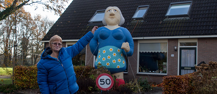 | Voor Susanne Emmens was het geen verrassing dinsdagochtend, de grote Sara die in de tuin stond en duidelijk maakte dat ze vandaag vijftig was geworden. 'Als je dat voor anderen regelt, kun je zelf ook zoiets verwachten', laat ze lachend weten. Susanne die aan de Stelmaker woont is geboren en getogen aan de Oostingslaan. Als ze niet met het huishouden bezig is mag ze graag kantklossen. |