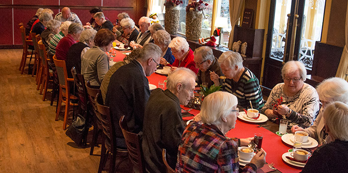 veld opgestart. Gemiddeld doen er zo'n dertig mensen aan de activiteit mee, die tussen twaalf en twee uur gezellig met elkaar eten. 'Naast het eten wordt er gewoon lekker met elkaar gekletst, en dat heb je als alleenstaande thuis niet', laat een deelnemer weten. Deze keer genoten de deelnemers van een uiensoepje, stoofpotje met krieltjes en salade en een heerlijke warme kersenwafel. |