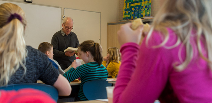 | 'Op 't Spectrum hebben we het eigenlijk altijd anders gedaan', delen de voorleesmoeders en -opa met elkaar als ze even voor tienen samen een bakkie doen. Woensdag begonnen de Nationale Voorleesdagen op veel scholen met een voorleesontbijt. Op 't Spectrum niet, vrijwilligers van de bieb lazen bij de jongste groepen het verhaal van Boer Boris voor. Vanaf groep drie werd er even na tienen door moeders en één opa voorgelezen. Pipi Langkous, Superjuffie en Auke waren een paar van de boeken waaruit werd voorgelezen. Meester ehh meneer Driessen, zoals oud schooldirecteur Jaap Driessen door leerkracht Jeroen werd voorgesteld, las de kinderen an groep 7 voor uit Dummie de Mummie en de dans van de Cobra. Aandachtig werd er door de kinderen, terwijl ze genoten van een plakje cake en bekertje fris, geluisterd naar het verhaal. Het is dan toch weer anders als dat je zelf leest of de film van het boek bekijkt. |