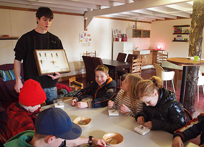 | Op de eerste dag van de voorjaarsvakantie is een groep Peizer schooljeugd met IVN naar Leens geweest. Een van de begeleidende ouders laat weten dat de jongeren de jeugdexcursie naar DoeZoo heel leuk hebben gevonden en de begeleiders net zoo. Op de foto krijgen de jongeren informatie over en instructie over hoe ze een sprinkhaan kunnen prepareren, iets wat ze daarna ook met de nodige voorzichtigheid mochten gaan doen. |