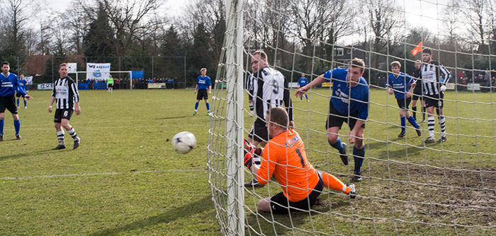 | Een tel later zal de voetbal na een vrije trap van Simon Wekema tegen de touwen achter de keeper van Roden slaan. Het was de eerste van drie doelpunten die de Peizenaren in de derby van Noordenveld voor ruim vierhonderd toeschouwers wisten te maken. |