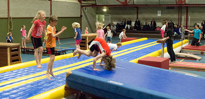 In de sporthal had sportcoach Anita Scholten voor de jongste basisschool groepen de Tumblingbaan weer opgeblazen. Zo'n dertig kinderen waren naar de sporthal gekomen om zich eens lekker uit te leven. Met behulp van kasten, minitram, banken en springplanken waren er drie parcourtjes uitgezet waardoor de kinderen lekker veel aan klauteren en springen toe kwamen. |