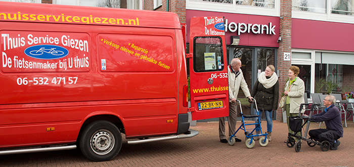 | Hij stond er weer vrijdagmiddag voor de Hoprank; de rode bus van Thuis Service Giezen. Voor het vijfde jaar organiseert Welzijn in Noordenveld samen met fietsenmaker Jan Giezen deze rollator keuring. Giezen kijkt de rollator voor de mensen in zijn rijdende werkplaats even na en daarbij is er, volgens hem, haast geen rollator die niet even bijgesteld of wat schroefjes aangedraaid moet hebben. 'Das ook geen wonder', reageerde de mevrouw van wie hij net de rollator onder handen had, 'wij hobbelen wat af op die soms zeer oneffen troittoirs'. Dit jaar was voor Welzijn Rosalie Kiers met Jan op pad, Rosalie adviseerde de gebruikers over hun lichaamshouding achter de rollator. 'Vooral de hoogte afstelling is een punt van aandacht', vertelde Rosalie. |