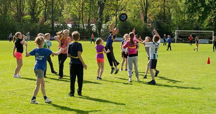 | Op de velden van de voetbalvereniging hebben leerlingen van beide Peizer basisscholen donderdag weer hun jaarlijkse sportdag beleefd. De vaste atletiekonderdelen, zoals bijvoorbeeld sprinten, behendigheidsparcours en verspringen, vormen de basis voor deze dag, daarnaast komen de leerlingen elk jaar ook in aanraking met andere sporten. Zo werd er nu een handbalclinic, in de sporthal, gegeven. Op het hoofdveld waren drie frisbee veldjes uitgezet waar tegen elkaar werd gestreden. Bij het frisbee is het de bedoeling de frisbee achter de verdedigingslijn van de tegenstander te vangen. 'Het mooie van frisbee is dat de regels dusdanig eenvoudig en makkelijk zijn dat het spel zonder scheidsrechter gespeeld wordt', verteld vakleerkracht gymnastiek Bert Geerding. |