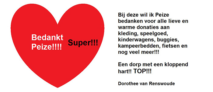 Organisatrice bedankt Vanuit Overijssel ontving DitisPeize een reactie over de actie van Dorothee van Renswoude. 'Wat een kanjer ben je zus, dat je belangeloos een volle week en langer in touw bent! Het hart van een medemens die groots is in haar doen en ook handelen dat verdient groot respect en wat mij betreft nog veel meer! Lieve zus succes met het afronden van je liefdevolle actie', Isabella! |
