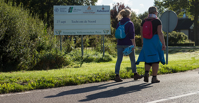 Zondag zijn 5000 deelnemers aan de Tocht om de Noord door Peize gewandeld. De wandelaars die door de natuur van de Bommelier het dorp in kwamen hadden daar een welkomsspandoek moeten zien. Onverlaten hebben deze echter in de nacht van zaterdag op zondag weggehaald. Op een te kleine stempelpost na was dit, voor zover bekend, de enige wanklank en vonden deelnemers, dorpsgenoten en organisatoren het super. Johan Sagel (Dorpshuis Peize) en Linda Talens (Handelsvereniging Peize) was het gelukt om een prachtig stukje Peizer promotie te organiseren. Via kleurrijke slingers was de tocht door Peize goed te volgen en kwamen wandelaars onder meer door kroeg, kerk en dorpshuis. Op diverse plaatsen in het dorp werden de wandelaars door Peizer muzikanten aangenaam vermaakt. Het college van Noordenveld liep de 40km lange tocht in estafette vorm waarbij wethouder Alex Wekema op de Brink de stempelkaart van Henk Kosters overnam.