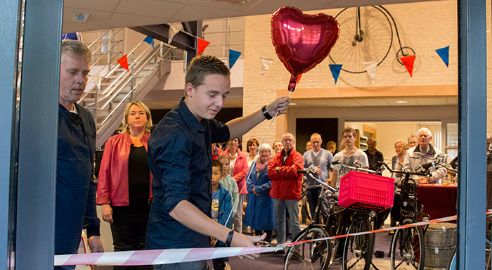 | Onder het toeziend oog van zijn vader en moeder heeft Chiel van Slooten met zijn veel te vroeg gestorven zusje, symbolisch als ballon in de hand, namens de hele familie de nieuwe Van Slooten Tweewielers geopend. Na het doorknippen van het lint, die door het personeel van van Slooten werd strak getrokken, nam het gezin buiten een moment voor elkaar door de ballon te laten gaan. Van Slooten die sinds 2008 met zijn zaak in Peize is gevestigd heeft het oude Rabobankpand aan de Hoofdstraat 17 omgetoverd tot een prachtige fietsenzaak. Terug in de zaak was het weer handen schudden voor de familie want aan de uitnodiging om de 'Opening' met hun te vieren was door velen gehoor gegeven. |