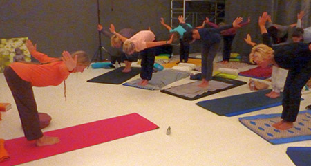 | De tweede yoga gastles, naar aanleiding van het jubileum van yogazolder Sense of Living, was wederom in de mooie fotostudio van Alfred Oosterman. De drukbezochte Satyananda yogales werd gegeven door Catherine Vanderpitte. Met haar charmante Franse accent gaf ze onder andere een serie antireumatische oefeningen voor alle gewrichten 'pawan muhktasana' genaamd. De yogales werd afgesloten door een heerlijke eindontspanning. |