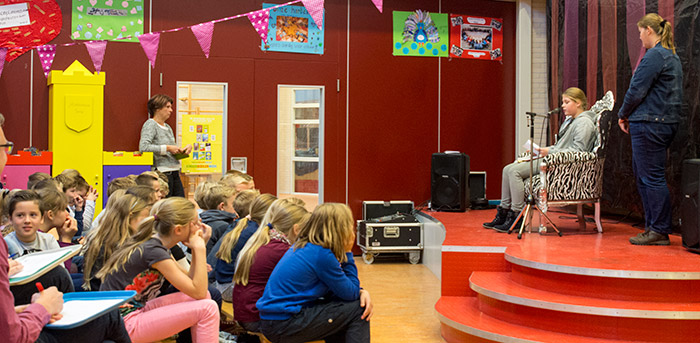 leeswedstrijd gehouden. Na voorrondes in de klas mochten van de groepen 3 t/m8, 2 of 3 leerlingen gezeten in de fraaie troon voorlezen. Alle deelnemers hebben een oorkonde en boekenbon gekregen en als extra cadeautje van boekhandel Daan Nijman hebben ze allemaal een boek erbij gekregen. Voor de deelnemers van groep 8 was het een extra spannend gebeuren, want de winnaar gaat de school vertegen-woordigen bij de gemeentelijke voorleeswedstrijd. Waarna er vervolgens nog een mogelijk Drents en landelijke wedstrijd volgen. Mirthe Meyering die uit het boek Juffrouw Pots van Tosca Menten voorlas had dit volgens de jury het best gedaan en werd voorleeskampioen 2015. |