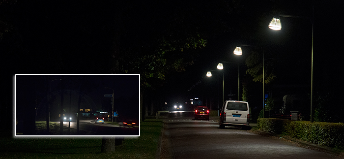 | De eerste vier straatlantaarns op de foto branden de volgende twintig op de Groningerweg niet!