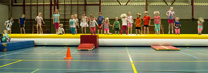 | De jongste groepen van de Peizer basisscholen konden zich dinsdag in de sporthal weer lekker uitleven op de tumblingbaan. Sportcoach Anita Scholten had voor de kinderen die op deze ladderactiviteit waren afgekomen weer leuke en gekke oefeningen bedacht. De kinderen vermaakten zich uitstekend met springen, op de billen ploffen, wiebelig opstaan en rondjes draaien. Niets was te gek en alles gebeurde met een grote glimlach. |