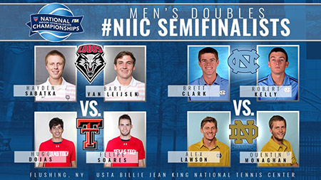 | Sinds augustus 2014 speelt Bart College tennis voor de University of New Mexico (UNM) in Albuquerque. College tennis speel je met een team van 6 spelers, in het najaar speel je steeds individuele toernooien (enkel en dubbel) en in het voorjaar speel je teamwedstrijden met 6 spelers. Bart vertegenwoordigt de University en speelt toernooien door de hele USA. Dit najaar is heel goed gegaan en uiteindelijk wist met Bart zich, samen met zijn partner Hayden Sabatka uit Denver, te plaatsen voor de Nationale kampioenschappen Indoor in New York. Dit toernooi wordt gespeeld op het park waar ook de US Open wordt gespeeld. Na 2 gewonnen rondes zaten Bart en Hayden bij de laatste 4 teams van de USA, deze halve finale werd net verloren. Na winst in de 1e set met 6-4 werd de 2e set verloren. De beslissende tiebreak werd uiteindelijk verloren ze met 11-9. Bart verloor geen enkele keer zijn service en kreeg in het hele toernooi maar 15 punten tegen op zijn service. In januari zal de nieuwe ranking worden opgesteld en Bart en Hayden zullen daar de top 5 binnen komen. Op de foto de digitale aankondiging van de halve finale. |