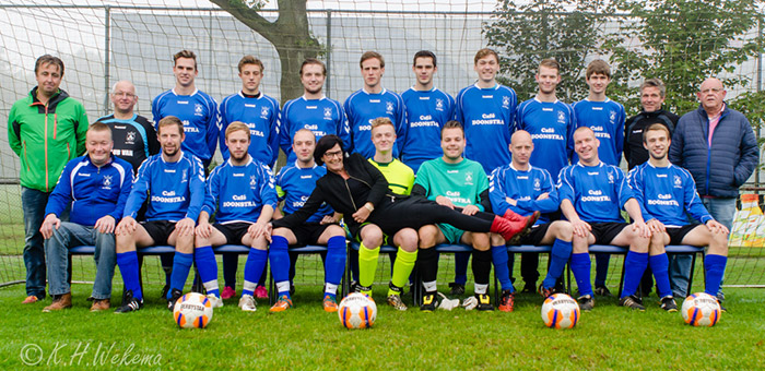 | De sponsorovereenkomst tussen Cafe Boonstra en de VV Peize is weer met 3 jaar verlengd. Het bestuur van de voetbalvereniging is heel blij dat deze jarenlange samenwerking gecontinueerd wordt. Cafe Boonstra fungeert als hoofdsponsor van het 2e team van de VV Peize en als subsponsor van het 1e team. Op de foto het 2e team inclusief de begeleiding in de nieuwe kleding met Yvonne Boonstra namens Cafe Boonstra en Arie Kregel namens subsponsor Garage De Westerd. Het 2e team van de VV Peize is de kweekvijver voor het 1e team; al een aantal seizoenen presteren een aantal routiniers samen met een grote groep hele jonge spelers heel goed op het een na hoogste landelijke nivo. Dit alles onder leiding van trainer-coach Mekke de Weert en leider Remmelt Schambach. |
