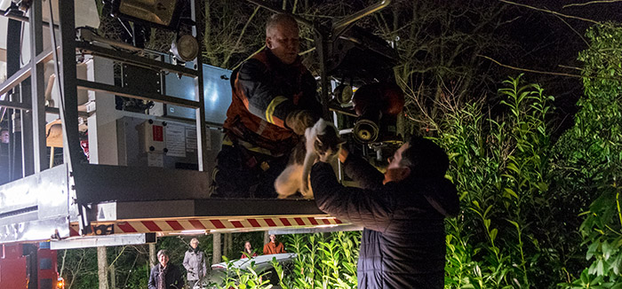 | De hoogwerker van de brandweer Groningen kwam er zaterdagavond aan te pas om Mo uit de boom te halen. Mo is de poes van bewoners van de Hulstlaan. Doordat Mo al de hele dag in de boom zat en er uit zichzelf naar het zich liet aanzien niet uit zou komen belden de baasjes maar met de brandweer. De hoogwerker van de brandweer Groningen kwam daarop naar Peize om Mo uit de ongeveer 10 meter hoge boom te halen. Nadat de hoogwerker was opgesteld, wat door menig buurtbewoner werd gadegeslagen, was het snel 'kat in het bakje'. Mo die duidelijk liet merken het maar niets te vinden dat hij stevig door de brandweerman werd vastgehouden kon op de oprit gelukkig weer met zijn baasje worden herenigd. |